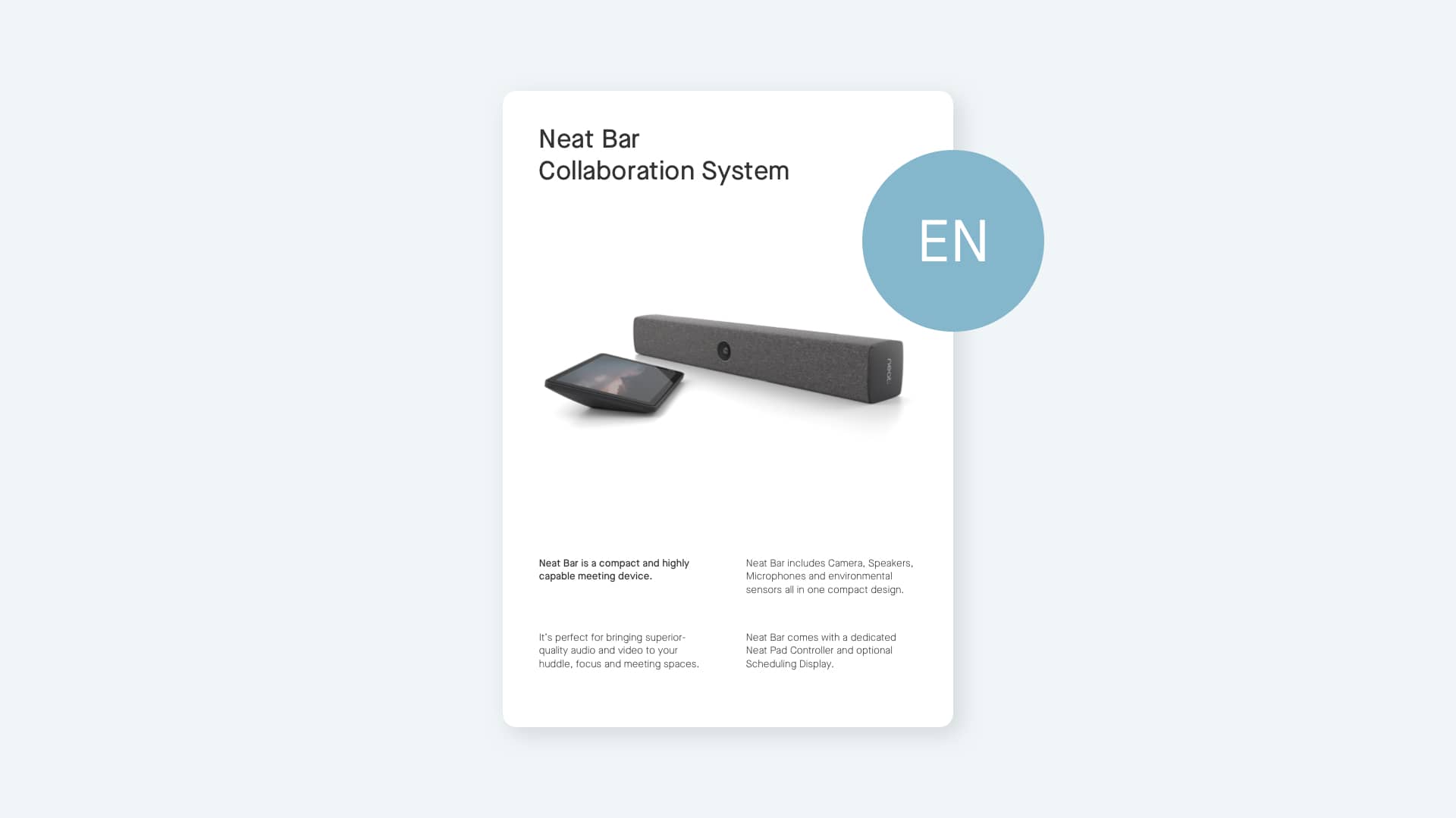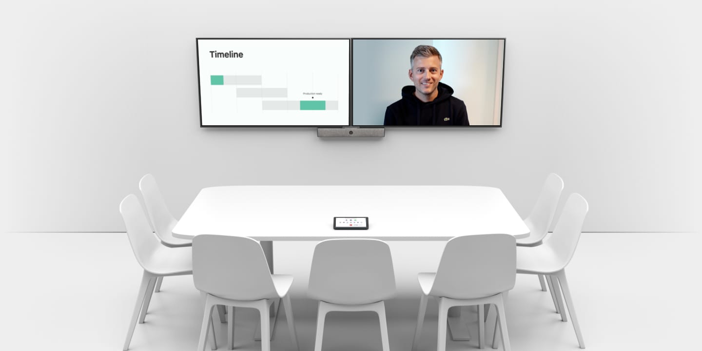 Neat Bar 是一款简单优雅、设计紧凑却功能强大的会议室设备,适用于 Zoom 或 Microsoft Teams。它非常适合为多达 10 人的会议室、小型会议空间或专注工作区提供卓越的音视频体验。你可以将 Neat Bar 安装在一台或两台显示器的上方或下方,并且它配备了 Neat Pad - 我们动态触控屏,可用于控制会议或在会议室外显示空间可用状态。
