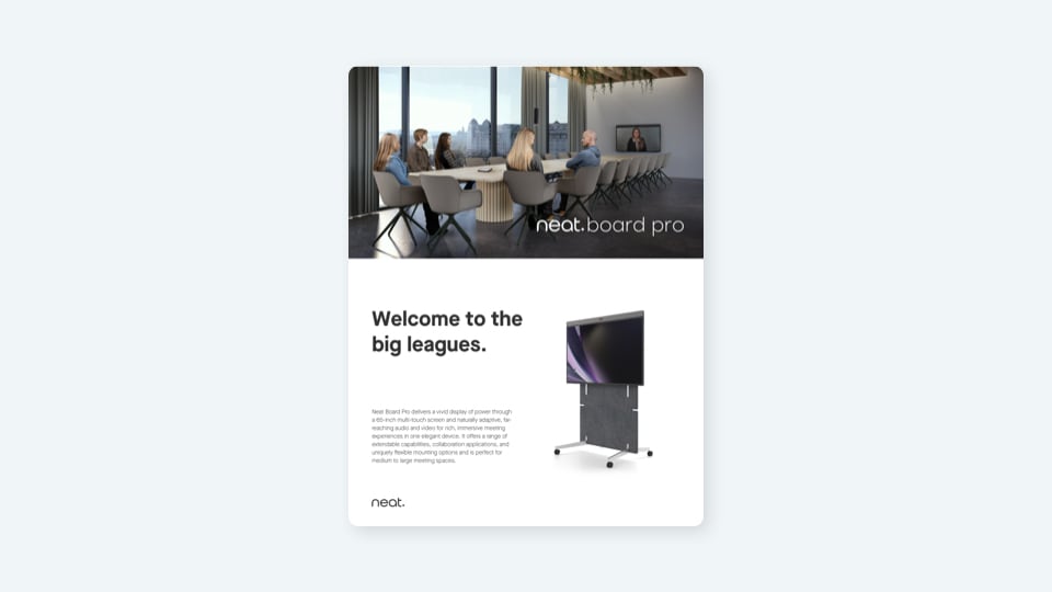 Neat Board Pro 凭借其尖端功能和灵活的安装选项,在各种规模和特点的空间中都能发挥奇效,成为我们迄今为止最具多功能性的设备。