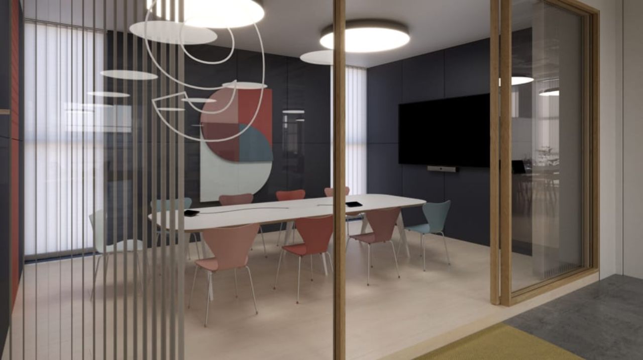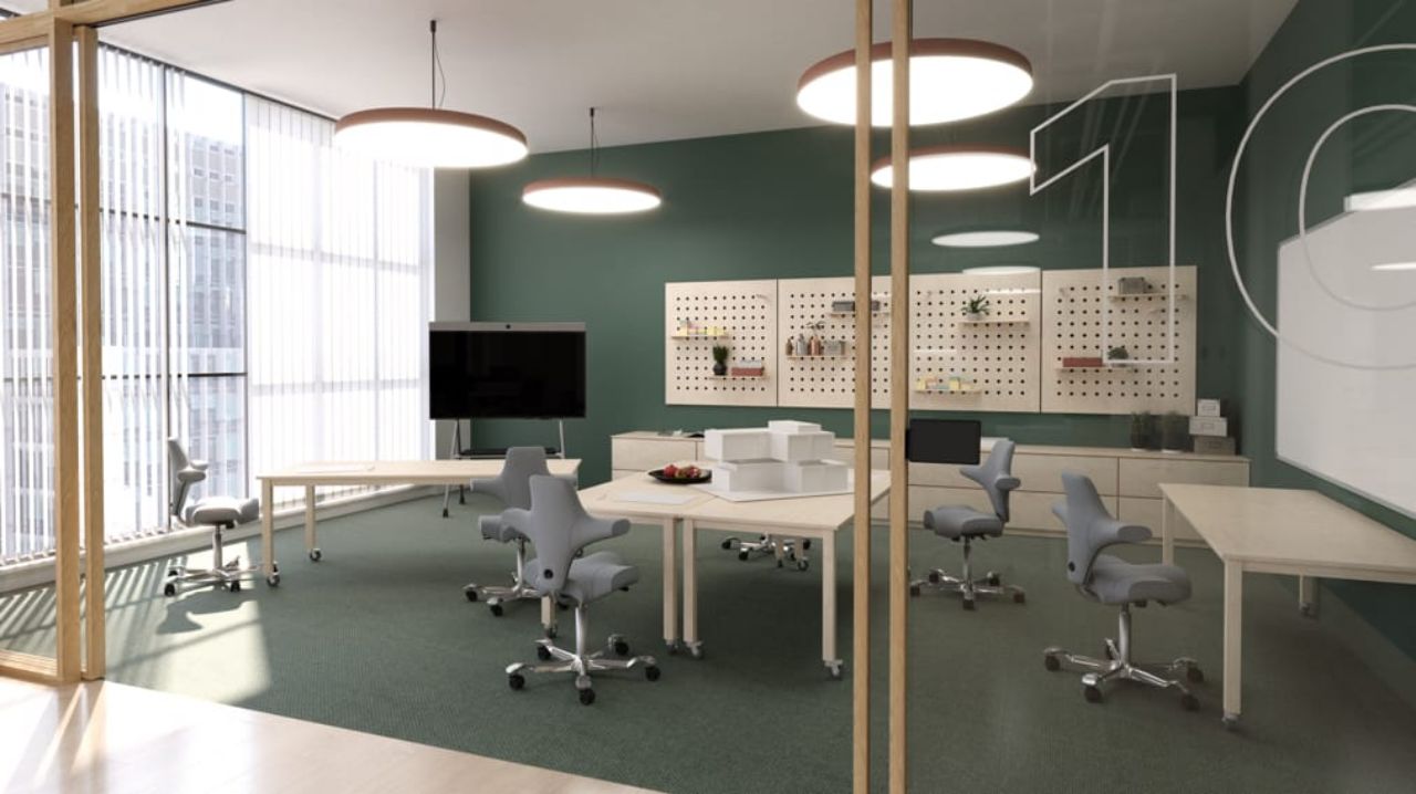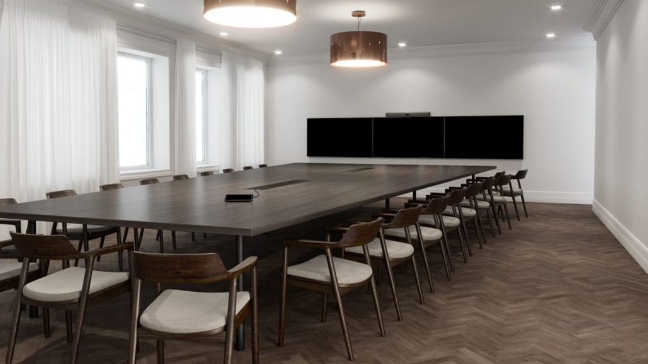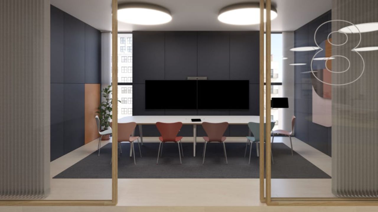 专为内容展示和远程参与者优化的会议室,确保所有在场参与者都能无障碍地看到屏幕。自然光和天花板灯光提供理想照明,地毯、墙板和窗帘提供声学阻尼。
